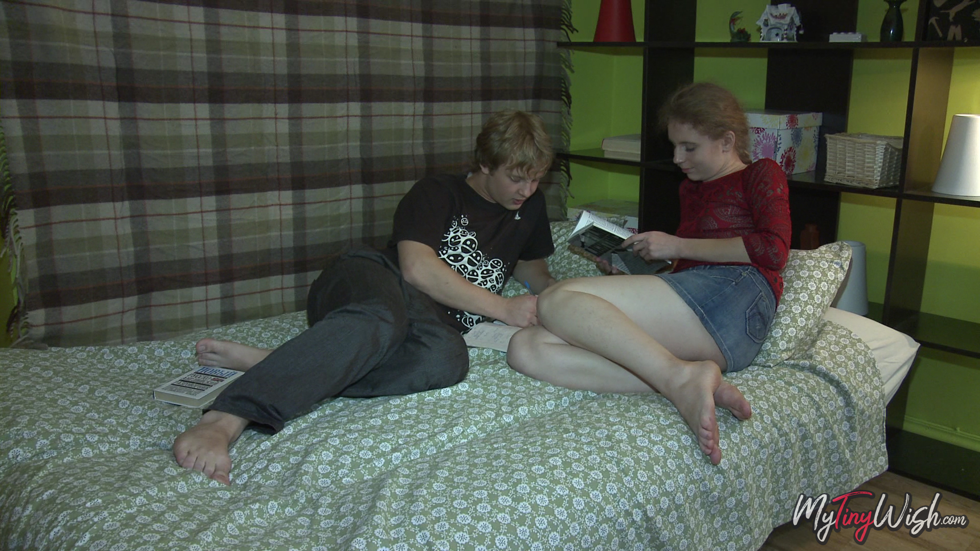 Modest teen and her man are reading books on the bed until they become bored. Naughty boy convinces lovely gal to forget about books and they start to make out. He undresses slim beauty not forgetting to worship her small tits and rub her wet pussy. She in return obediently polishes his manhood. Soon they are ready to make love in doggystyle. Excited belle even doesn't mind tasting rod inside her ass. Fantastic anal sex in all kind of poses ends for skinny nymph with amazing cumshot on her booty.
