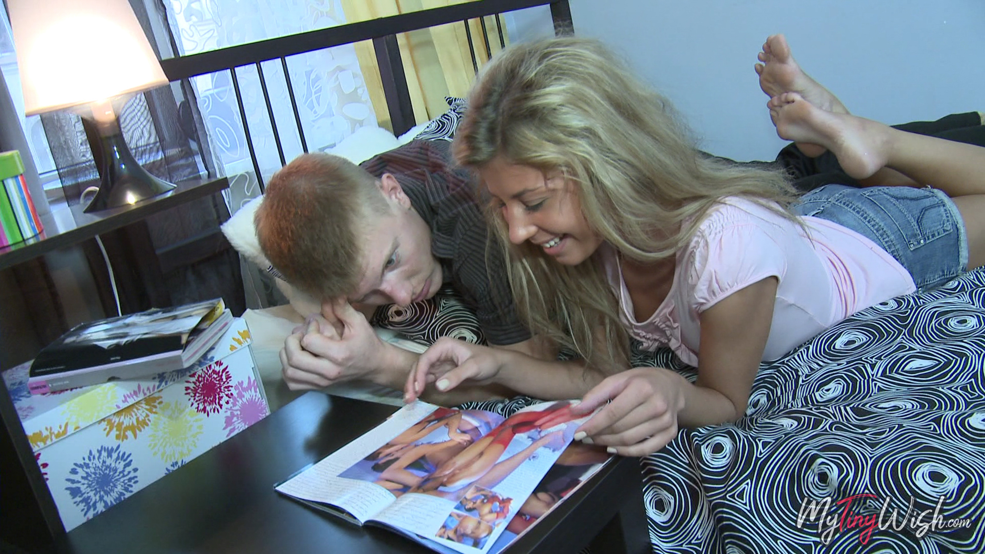 Skinny teen laughs while reading magazine and relaxing with best friend in the bedroom. But she doesn't mind luring him into other activities. They start to make out and soon fragile nymph is giving him a wonderful blowjob. Guy undresses cutie and starts drilling her in missionary pose. They make love in spoon and reverse cowgirl style until she is ready to taste guy's hard rod inside her asshole. He unhurriedly analyzes slender cutie in doggystyle before leaving hot sperm all over her firm booty.